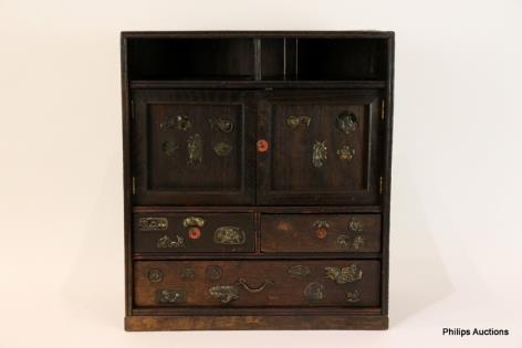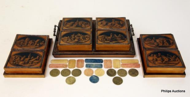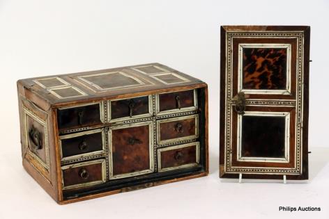 18th century Of rectangular form, the drop panel front (a/f) revealing an arrangement of eight small drawers, the whole with tortoiseshell panels decorated with ivory chequered trims, with side handles, as found with losses and repairs. Height: 17cm Width: 28.5cm Depth: 20cm