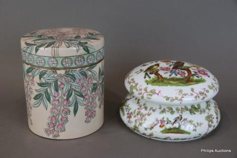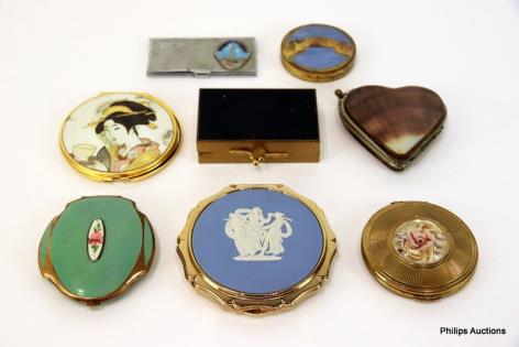 Comprising a Stratton compact with a Wedgwood jasper plaque of the 'Three Graces' to the hinged top, a small heart-shaped shell purse with a lined interior, a Japanese 'Geisha' pocket mirror, an Art Deco enamelled compact with floral cartouche, a Brisbane city hall stamp box, a suitcase form small purse and others. Diameter: 8.5cm (wedgewood)