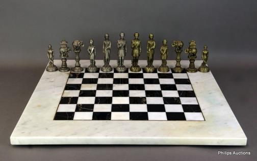 20th century The large polished marble chessboard with a complete set of figural Indian themed cast brass and white metal pieces, each on circular bases with green and red velvet pads underside. Height: 3cm Length: 55cm Width: 55cm (chess board) Height: 13.5cm (figure) and smaller