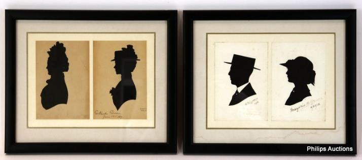 Dated 1889 and 1913 The framed silhouette bust portraits, scissors cut from black inked paper mounted on white card, comprising one of Gertrude Green and S. Mieville dated June 22-23rd, 1889, and one by 'Mr Handrup' of Marjorie Green and N.B. Green, dated 4/23/13. Handrup was a Danish-born silhouette cutter who lived in London between the wars, operating a Silhouette Parlour at D.H.Evans in Oxford Street. Height: 22.5cm Width: 27cm