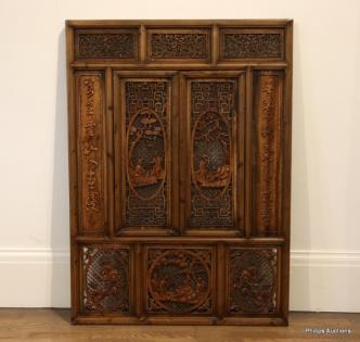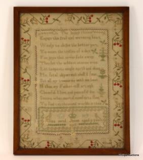 19th century The framed sampler on linen, worked by 'Eliza Sarah Jones, aged 9 years', with some fruiting vine patterned border, in a later wooden frame, as found with some repairs. Height: 43.5cm Width: 34cm