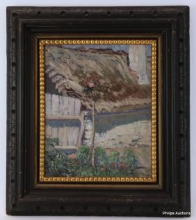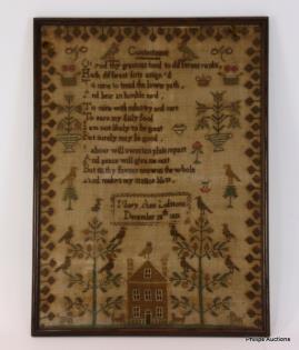 The framed pictorial sampler on linen, worked by Mary Ann Lidstone and dated December 20th, 1831, with house, birds, trees, pot plants and a patterned border. Height: 55.5cm Width: 41cm