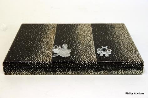 Comprising a Vietnamese eggshell lacquer rectangular box and cover with linear myriad eggshells design, together with two boxed Swarovski crystal small animal ornaments: a 'Snail babies on vine Leaf' (Des. Edith Mair, 2001; no. 268196) and a 'Mini frog' with green eyes (Des. Gabriele Stamey, 1994; no. 183113). Height: 3.5cm Length: 30.5cm Width: 21.5cm (box)