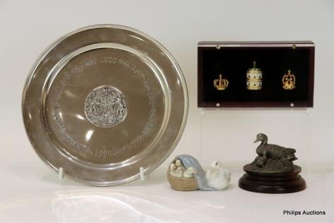 Comprising a boxed commemorative Queen Mother 90th birthday pewter plate, a Downies set of miniature crowns including the coronation crowns of Napoleon and Josephine and the tiara of Pope Pius VII, together with a Lladro 'Ducklings' figurine (Des. Juan Huerta, no. 4895), and a Chilmark pewter goose and goslings figurine. Diameter: 25cm