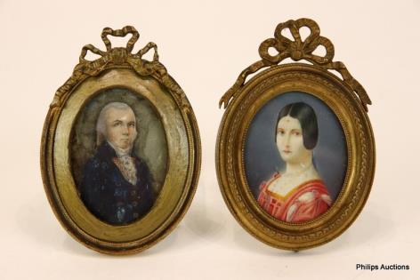 early 19th century The miniature oval busts of a lady and gentleman painted on ivory laid on card, housed in gilt metal ornate frames, one with easel back, both unsigned. Height: 10cm Width: 7cm and smaller