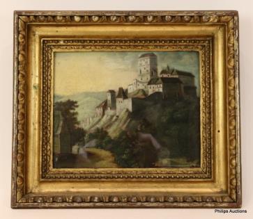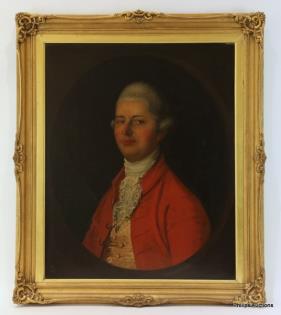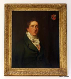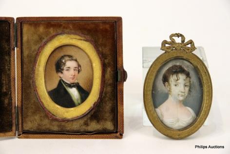 19th century The miniature oval bust portraits of a lady and gentleman painted on ivory laid on card, one housed in a gilt metal ornate frame, the other within a brown velvet lined book form cover, both unsigned, one faintly inscribed 'James W. […]' and dated 1813. Height: 9cm Width: 8cm (case) and smaller