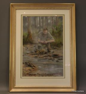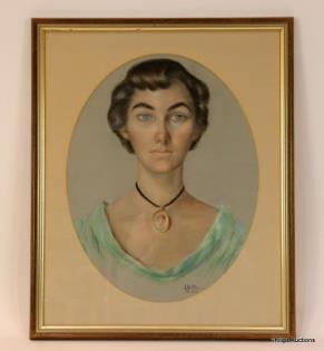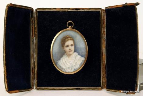 19th century The oval bust portrait of G. Mieville (1884), watercolour on ivory laid on card, in a gilt metal ornate frame with bail attachment, within a blue velvet lined and green leather fitted case, unsigned. Length: 14cm Width: 12cm (display Case) Length: 8cm Width: 6.5cm
