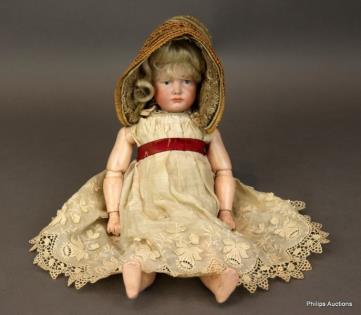 Kammer & Reinhardt, model 114, circa 1910 The character doll of cabinet size with painted blue eyes, closed pouty mouth and a blonde wig on a fully jointed composition body, dressed in frilled and embroidered cream voile and wearing a woven rattan bonnet, stamped the back of the head with 'K star R' mark and numbered 114 and 26. Length: 30cm