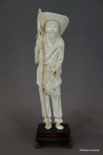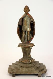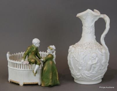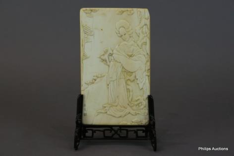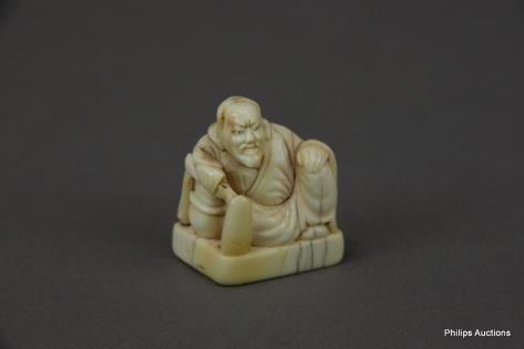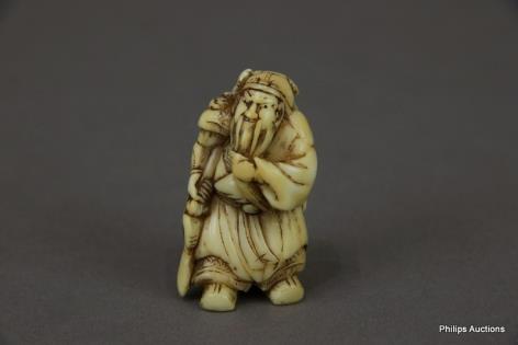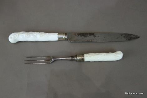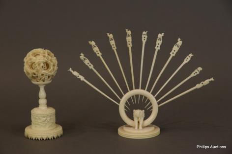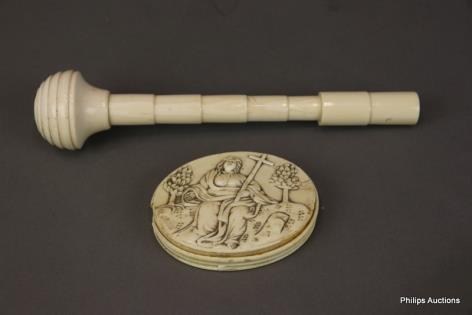 The c1900 ivory parasol handle with a stepped design, together with an oval trinket box (a/f), the cover relief carved with a religious scene, probably Dieppe ivory 19th century. Length: 22.5cm and smaller