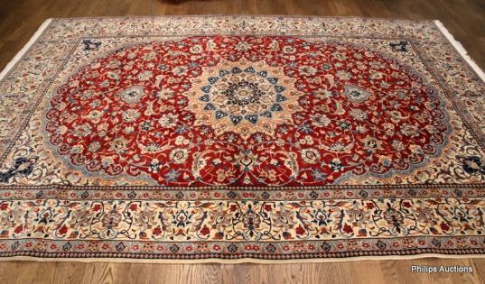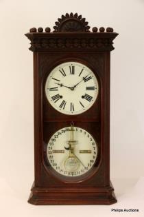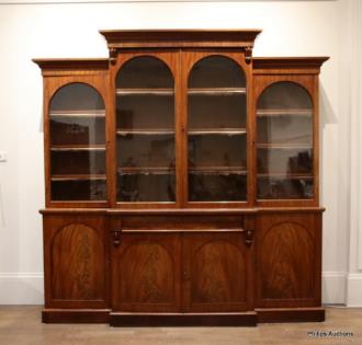 circa 1870 The everted pediment above four large arched and glazed doors with foliate corbels opening to adjustable shelving with the original gilded tan leather dust covers, above an extended base with a large central frieze drawers over four flame mahogany arch panelled doors flanked by acanthus leaf corbels, all upon a plinth base. Height: 251cm Width: 249cm Depth: 47cm