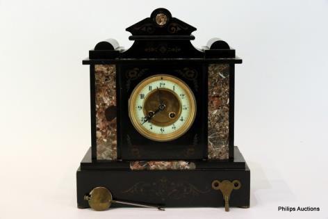 late 19th century With a grey marble top with moulded edges and canted corners above a drawer, fall front and three further drawers, the fall front with musical instrument and floral inlay, the interior with an arrangement of drawers, raised on short splayed feet, with neoclassical style mounts, handles, escutcheons and sabots. Height: 162cm Width: 89cm Depth: 39cm
