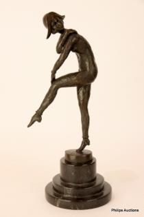 circa 1950s The serpentine top with moulded edges inset with a gilt and tooled tan leather surface, above three shaped frieze drawers, with matching tooled leather slides to the short ends, the hipped cabriole legs embellished with cast mounts and sabots, with key. Height: 76cm Width: 120cm Depth: 67cm