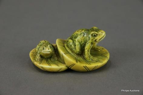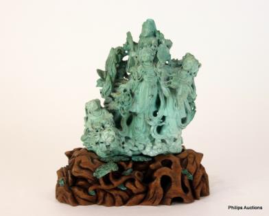 20th century naturalistically carved from a single slab of malachite as a crocodile mother and her offspring, each with inlaid eyes, upon a carved wooden stand. Height: 7.5cm Length: 15cm Width: 14cm