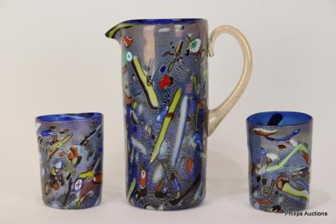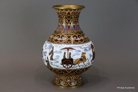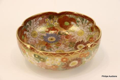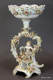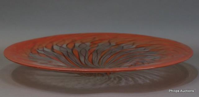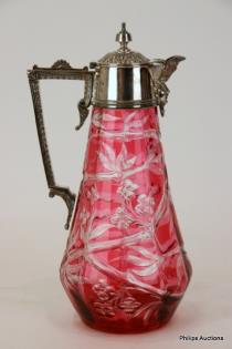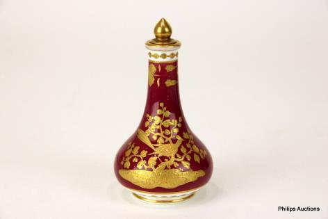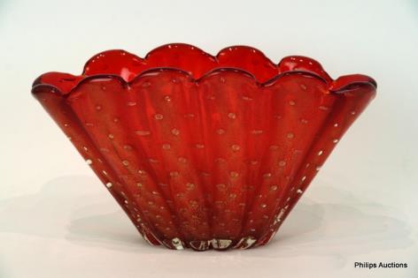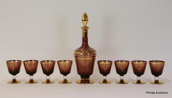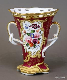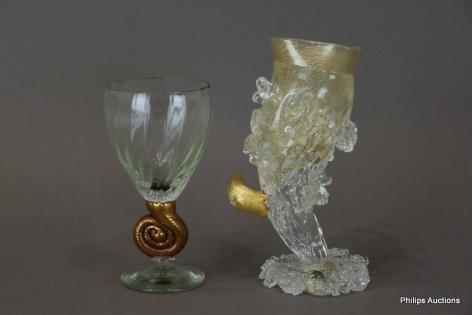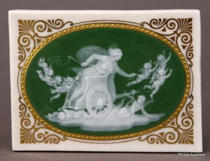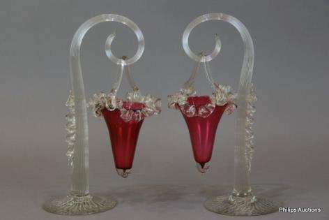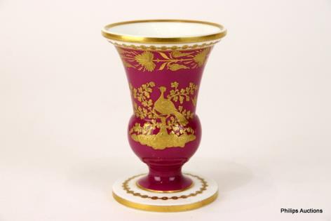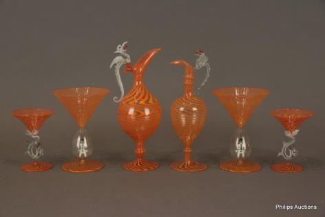 late 19th century The credenza with a serpentine front above a decorative skirt and a central panelled cupboards inlaid with a large floral bouquet and flanked by half columns inlaid and mounted with gilded Etruscan masks, and by serpentine glazed doors with red velvet lined internal shelves, all raised on a plinth base further decorated with gilded mounts. Ex. Philip Caldwell Auctions. Height: 108cm Width: 190cm Depth: 43cm
