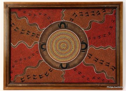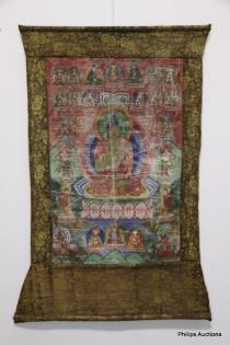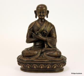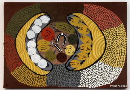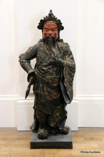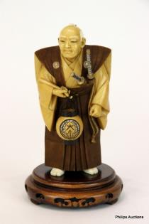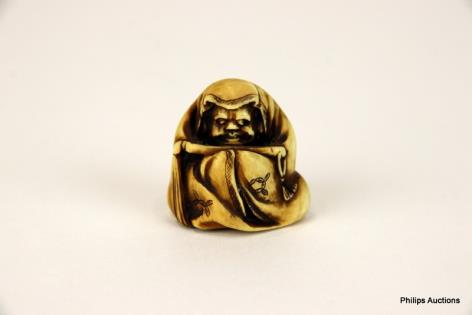 early 20th century The wavy tapering iron blade pattern-welded with pamor and with winged lion perabot, in its wood-lined and scroll embossed gilt metal scabbard with large ivory sarongan carved in relief on both sides with scenes from Balinese Hinduism and with a central protective monster mask (karang bhoma) to one side, the horn hilt carved as the demon Bhuta Nawasari. Length: 48cm