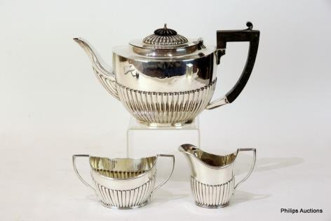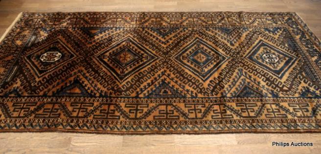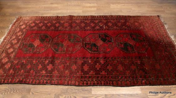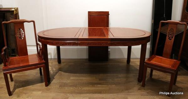 19th century The draw leaf rectangular extension table with thumb nail and bull nose moulded edge and plain skirt on baluster legs and brass cup castors, with two extension leaves, together with a set of four Victorian mahogany balloon back dining chairs covered in brown fabric and raised on turned front legs. Height: 78cm Length: 155cm Width: 115cm (table) Height: 88cm (chair)