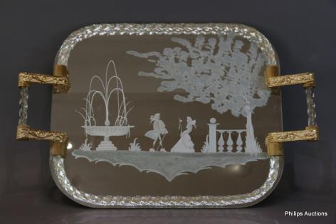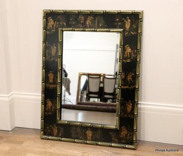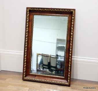 19th century Of typical form with an oval mirror set in a channel grooved frame with curvaceous carved side supports above a shaped base with two small hinged compartments with a flush lid. Height: 83cm Width: 73cm Depth: 30cm