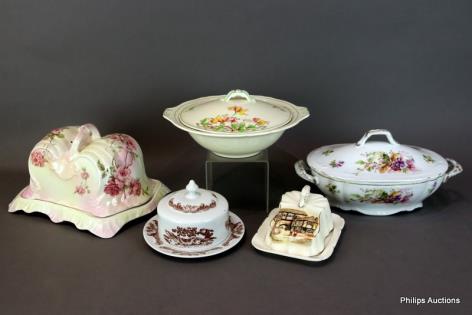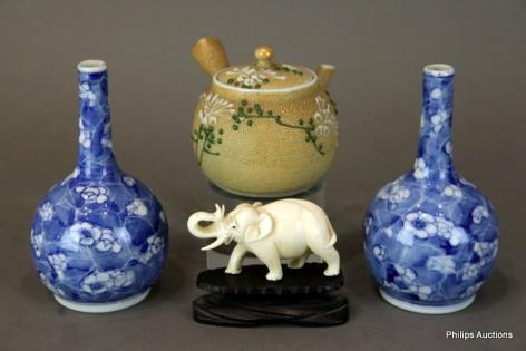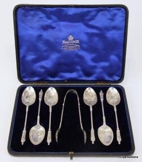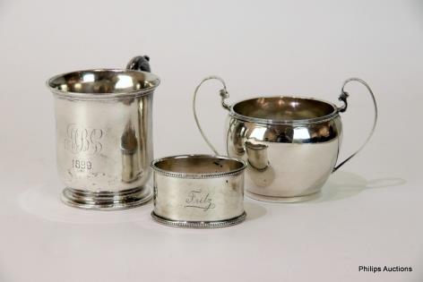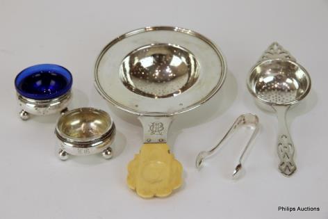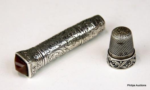Comprising an Edwardian sterling silver and ivory baby rattle in the form of a bell (1903 Birmingham, Crisford & Norris Ltd), two button hooks including one decorated with agates (c1900 Birmingham, Adie & Lovekin Ltd), an ivory tape measure, a small circular ivory box with a carved floral and beaded cover, a cased miniature razor (W.J. Myatt & Co, Birmingham) and an 1830s small book of religious stories. Length: 10.5cm Width: 7cm (prayer book)