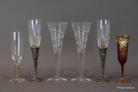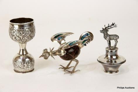 Comprising a Comyns of London silver filled 'Kittens Licking' figurine, stamped and with label underside, together with two other kitten figurines in white metal, a Swarovski crystal 'Leopard' (Des. Michael Stamey, 1997, No. 217093) in faceted clear crystal with amber tone eyes, and a glass ocelot (spotted wild cat) from Costa Rica. Height: 7cm and shorter