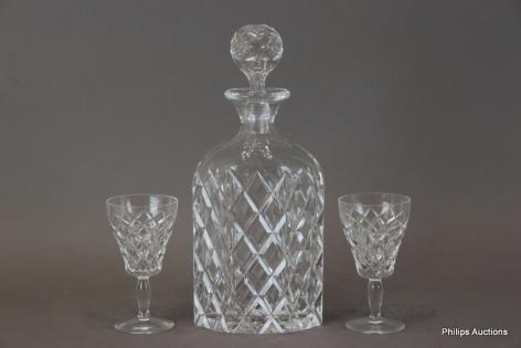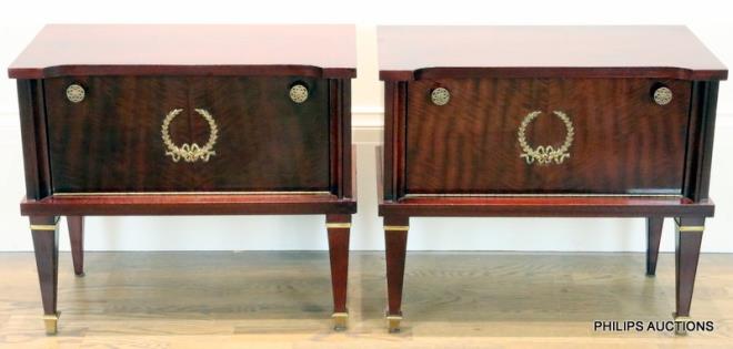 Mid-20th century The rectangular bedside cabinets, each with a well-figured plain top above a slightly recessed fall front, decorated with central gilt laurel wreath knotted by thin trailing ribbon and pierced knobs, raised on square tapering legs with capped feet. Height: 52cm Width: 60cm Depth: 33cm