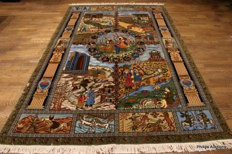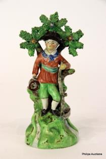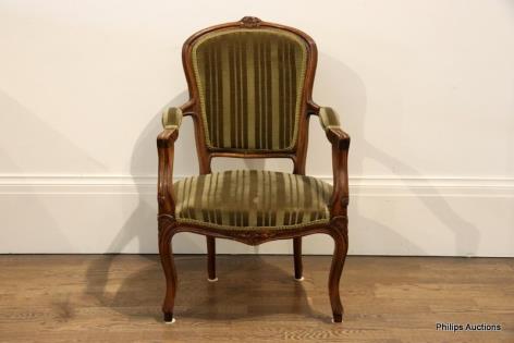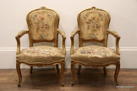 late 18th century Each with channelled frame with foliate carved crest, the cartouche back upholstered and issuing volute scrolled arms with shaped supports, the upholstered serpentine seat above a conforming seat rail, raised on cabriole legs with carved knees and feet, the floral tapestry upholstery as found. Height: 90cm Width: 60cm Depth: 61cm