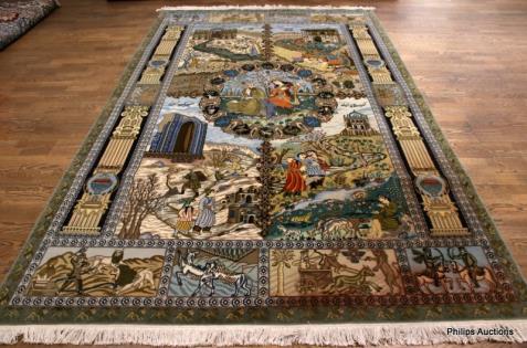 late 19th early 20th century Each with a finely-moulded frame with a carved foliate crest to the top-rail, the apron similarly decorated, upon cabriole legs terminating with castors, and covered in 'Jacobean Garden' tapestry fabric. Height: 104cm Width: 73cm Depth: 84cm