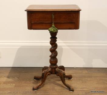 19th century The rectangular top with a moulded edge opening to a plain interior, with bottom drawer, upon a barley twist pedestal and four foliate carved and scrolled legs. Height: 77cm Width: 47cm Depth: 36cm