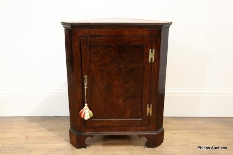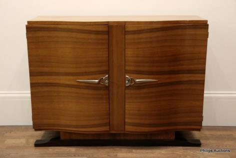 Circa 1920s Of shaped profile with two cupboard doors fitted with elegant escutcheons and backplates, opening to an interior with a single shelf, and raised on a plinth base, with two original keys. Height: 98cm Width: 128cm Depth: 44cm