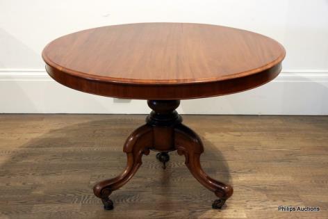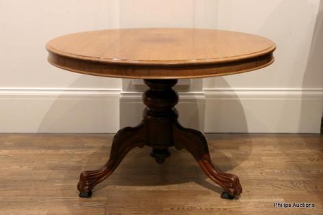 19th century The circular top with a moulded edge and plain skirt upon a turned baluster pedestal column with three down swept carved legs terminating in castors. Height: 76cm Diameter: 114cm