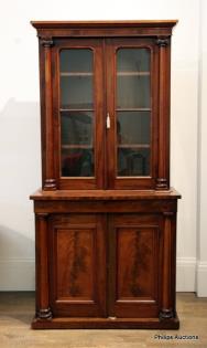 19th century The mahogany veneer bookcase with an everted cornice above double glazed doors flanked by turned columns surmounted by Ionic capitals over an extended base with a frieze drawer and two panelled cupboards in flame mahogany, supported on a plinth base, with internal shelves and one key, drawer lock a/f. Height: 227cm Width: 112cm Depth: 53cm
