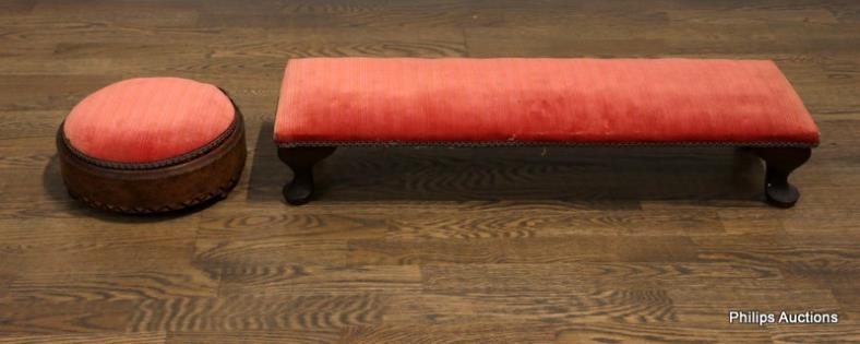early 20th century Comprising a round footstool with a chevron patterned inlaid border on brass ball feet, and a long footstool on carved short feet, both upholstered in pale red velvet. Height: 15cm Length: 78cm Width: 25cm and smaller