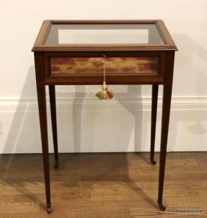early 20th century The display table for collectibles or jewellery, with a glazed hinged cover and sides, cross-banded and strung throughout, opening to a worn burgundy velvet lined interior, with lock and key, upon square tapering legs on castors. Height: 74cm Width: 52cm Depth: 39cm