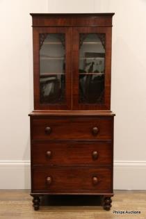 19th century The diminutive bookcase on chest with a carved and dentil-moulded cornice above an astragal-glazed door with internal shelves, above a drop-front desk section with carved detailing along the edge, and two half drawers over two graduated full width drawers, with rosette carved apron and raised on shaped feet. Height: 170cm Width: 62cm Depth: 44cm