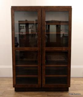 circa 1920s The burr walnut veneered bookcase of simple design, the glazed door with piano hinges opening to an interior with five adjustable shelves on each side, upon a slightly recessed plinth base, with keys. Height: 176cm Width: 121cm Depth: 56cm