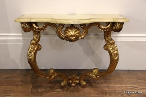 circa 1950s With a serpentine faux marble composite shelf upon C-scroll gilt brackets with foliate and shell decoration. Height: 51cm Width: 63cm Depth: 32cm