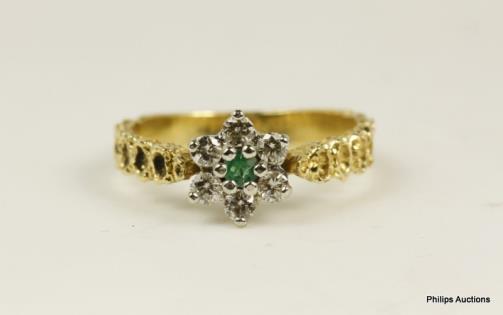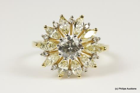 A GOLDEN YELLOW AND WHITE DIAMOND CLUSTER RING