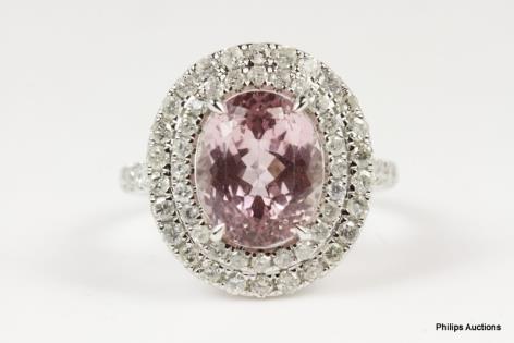 A LOVELY OVAL KUNZITE AND DOUBLE HALO DIAMOND CLUSTER RING