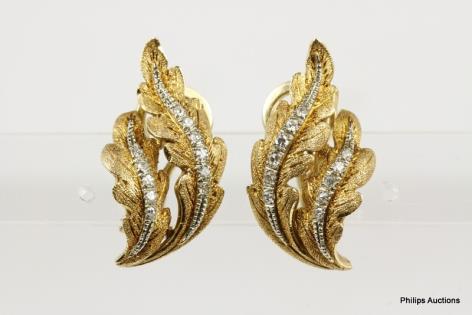 A FINE QUALITY PAIR OF DIAMOND DETAILED GOLD FEATHER EARRINGS