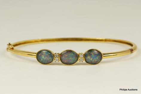 AN OPAL DOUBLET AND DIAMOND SET GOLD BANGLE