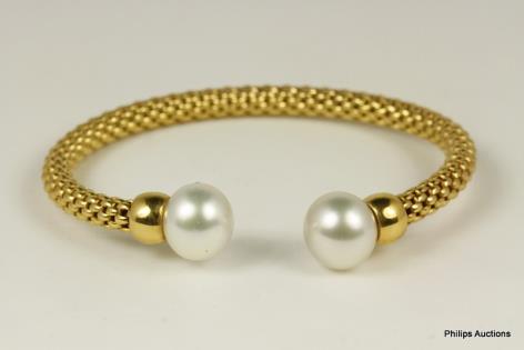 A STYLISH YELLOW GOLD WOVEN CUFF BANGLE SOUTH SEA PEARL SET