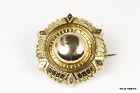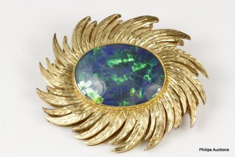 A QUALITY BLACK OPAL DOUBLET GOLD BROOCH OF ARTISAN STYLE