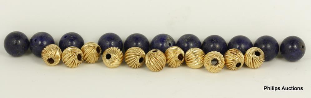 A VINTAGE OFFERING OF 14CT YELLOW GOLD RIBBED BEADS & LAPIS