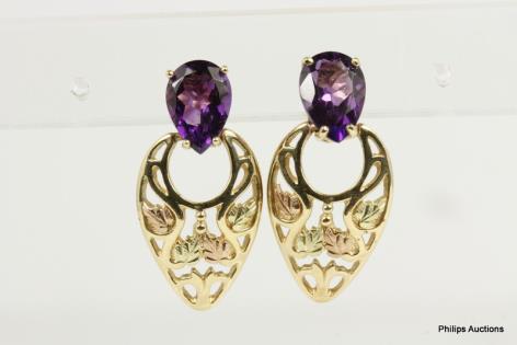 A PAIR OF VIBRANT AMETHYST AND TWO TONE GOLD EARRINGS