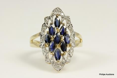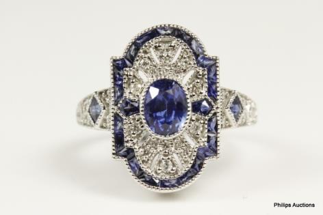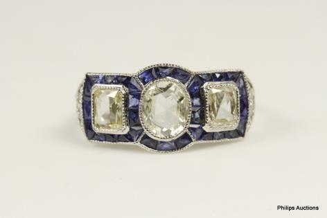AN ANTIQUE STYLED SAPPHIRE & DIAMOND PLAQUE CLUSTER RING