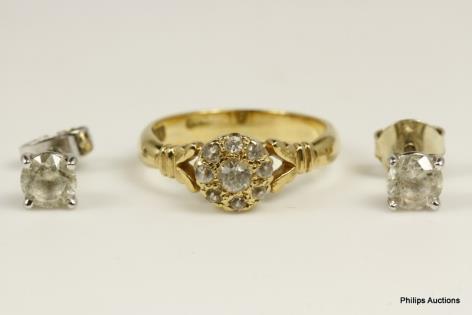A STONE DRESS RING & PAIR OF WHITE SAPPHIRE STUD EARRINGS