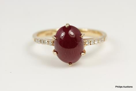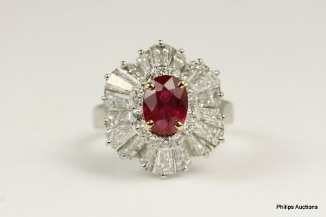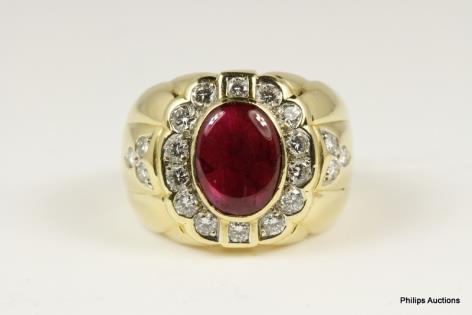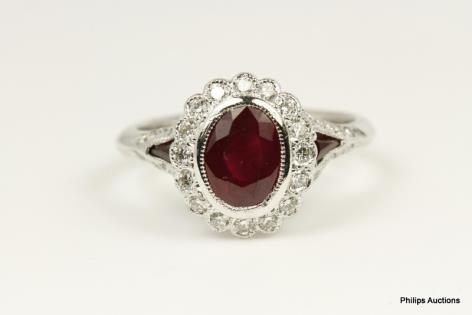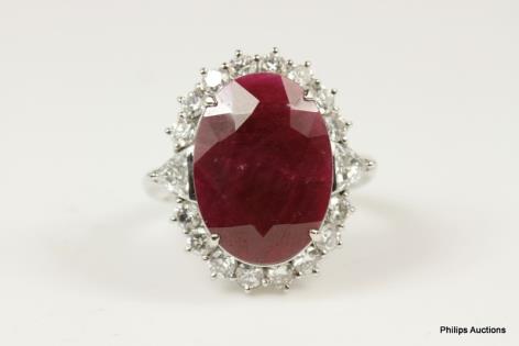A CLASSIC OVAL RUBY AND DIAMOND CLUSTER RING.