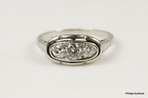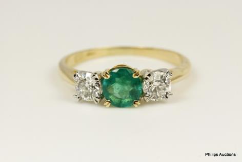 A VIBRANT EMERALD AND DIAMOND THREE STONE RING