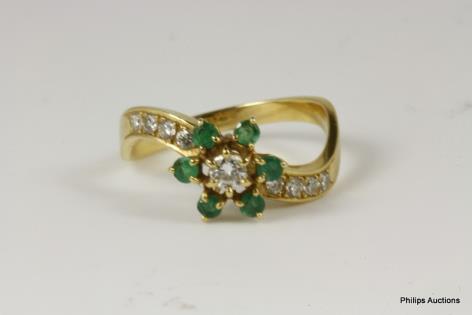 AN EMERALD AND DIAMOND FLORAL CLUSTER SET DRESS RING