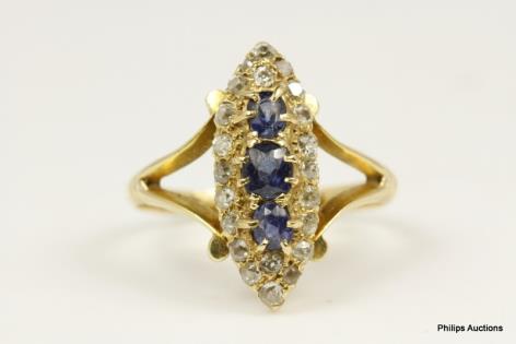 AN ANTIQUE 18CT GOLD SAPPHIRE AND DIAMOND MARQUISE RING