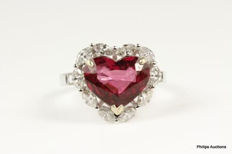A PINK TOURMALINE AND DIAMOND HEART SHAPED CLUSTER RING